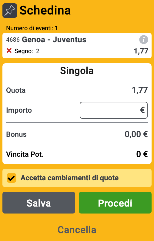 - Seleziona il risultato (es. vittoria, pareggio, sconfitta).