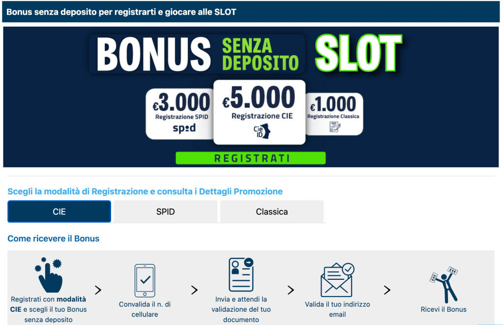 • L’importo del bonus senza deposito può variare fino a €5.000, e il bonus massimo è ottenibile se effettui la registrazione con CIE (Carta D’Identità Elettronica).