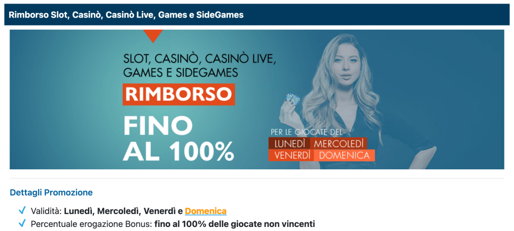• Tipologia di Bonus: Betflag offre anche un bonus di tipo rimborso il Lunedì, Mercoledì, Venerdì e Domenica di ogni settimana e puoi ottenere fino al 100% delle giocate non vincenti nelle seguenti sezioni di gioco: